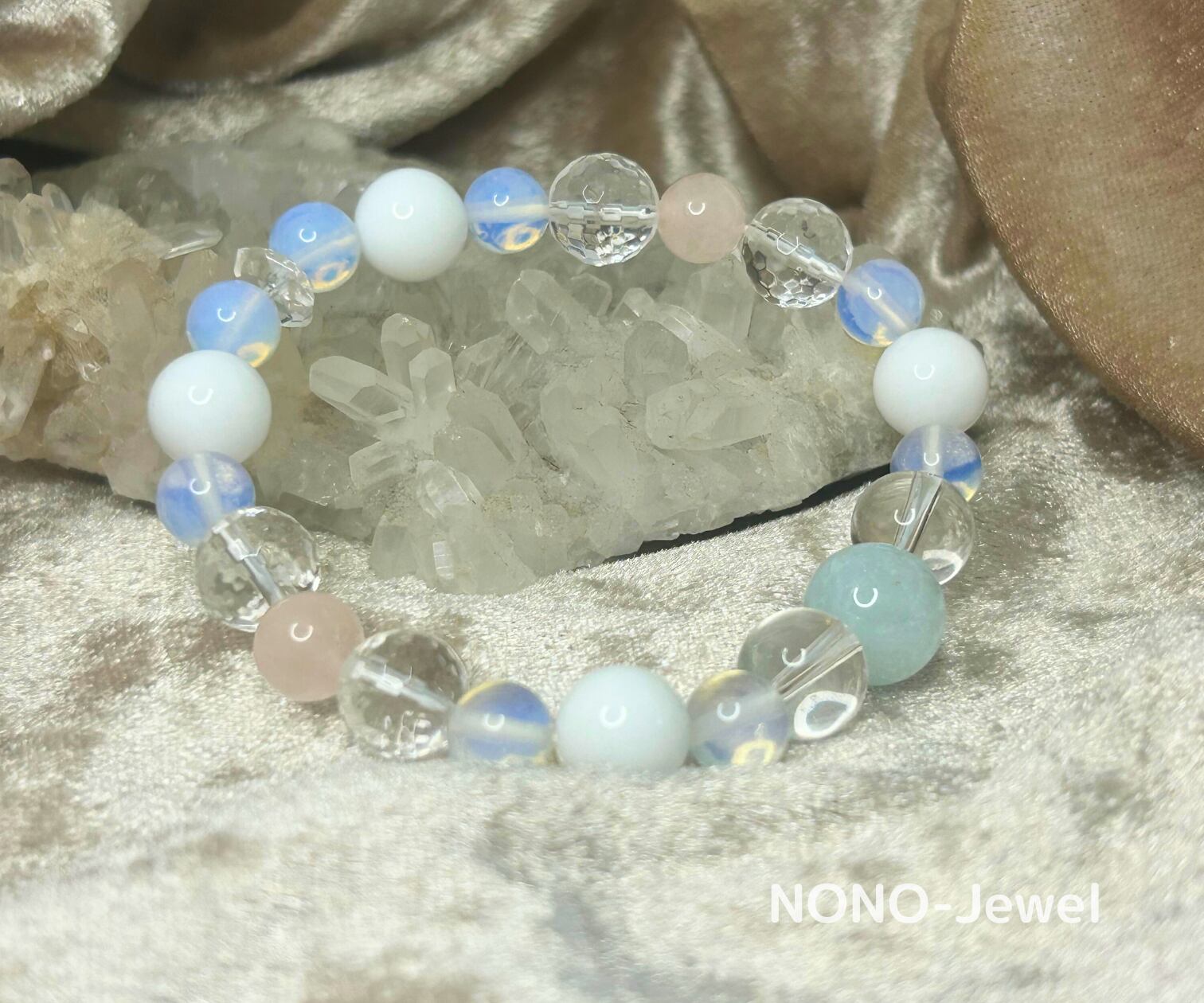 光を受けて幻想的に輝くオーロラクォーツ、愛を育むローズクォーツ、心にやさしく寄り添うアクアマリン、そして守護をもたらすホワイトオニキスのエネルギーを融合させたこのブレスレットは、あなたの心を温め、穏やかな思いを引き出します。美しいカラーバランスが、見た目にも心を和ませ、日常の中に彩りを添えてくれます。